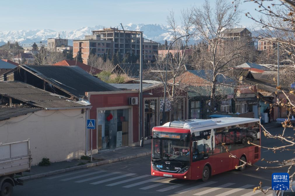 3月24日,在阿塞拜疆甘贾,中国宇通品牌红色公交车行驶在街头。新华社记者 陈俊锋 摄