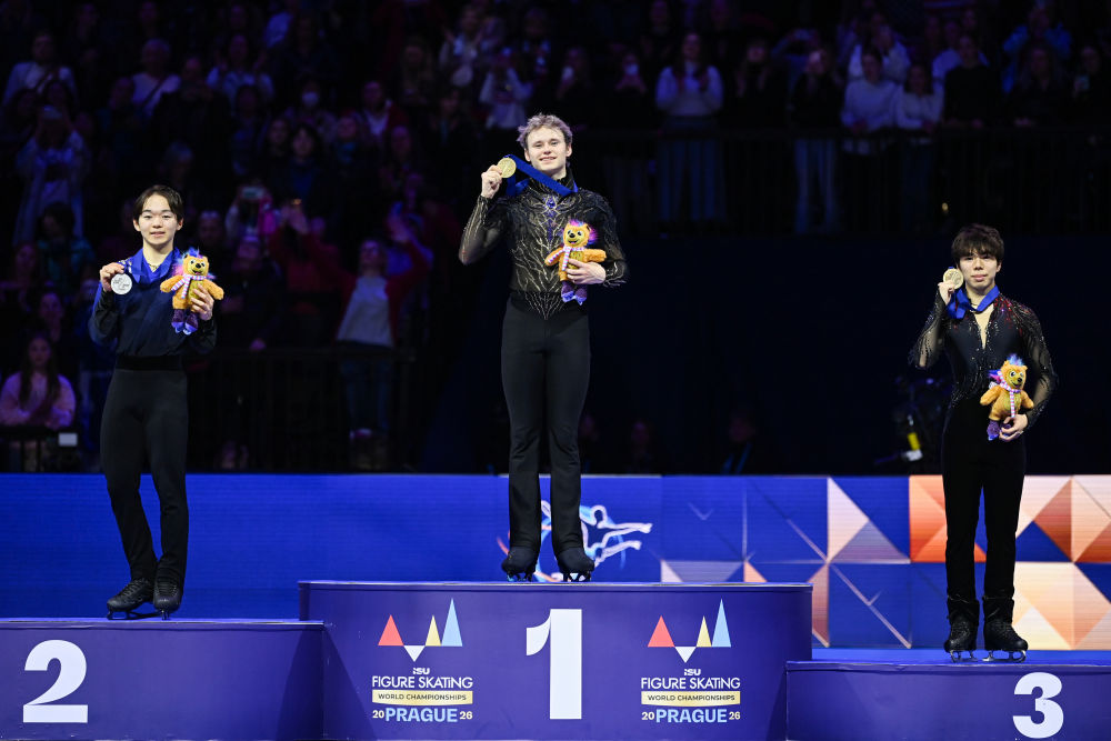 3月28日,冠军美国选手马里宁(中)、亚军日本选手键山优真(左)、季军日本选手佐藤骏在男子单人滑颁奖仪式上。新华社记者 张豪夫 摄