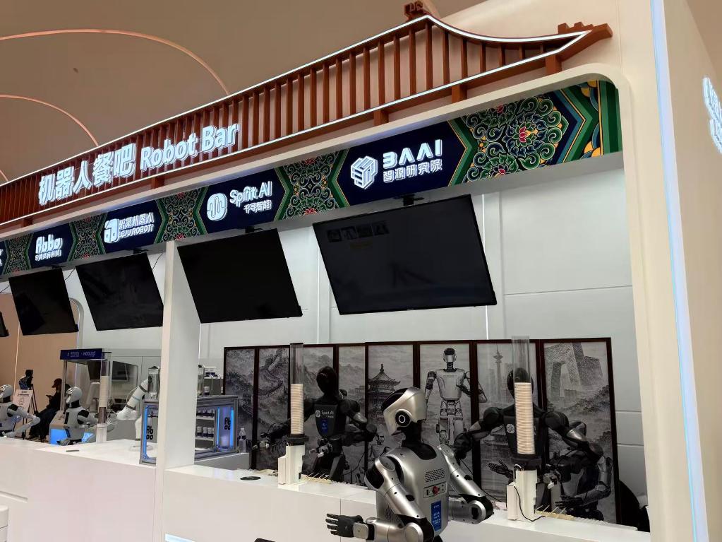 来自不同公司的机器人在“机器人餐吧”内服务。新华社记者 张骁 摄