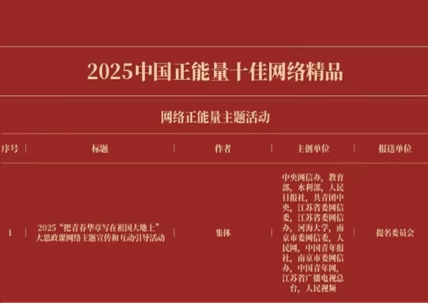 由中央网信办主办的2025中国正能量网络精品征集展播活动今天揭晓结果。在河海大学举行的2025“把青春华章写在祖国大地上”大思政课网络主题宣传和互动引导活动入选2025中国正能量十佳网络精品网络正能量主题活动。
