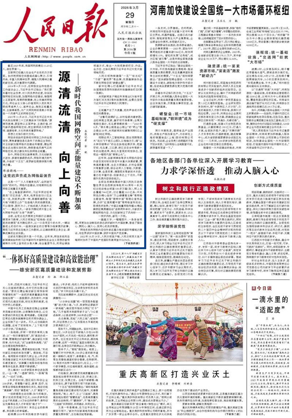 《人民日报》(2026年03月29日第01版)发表了“源清流清 向上向善——新时代我国网络空间正能量建设不断加强”提及了河海大学这一入选网络正能量主题活动。一起来看——