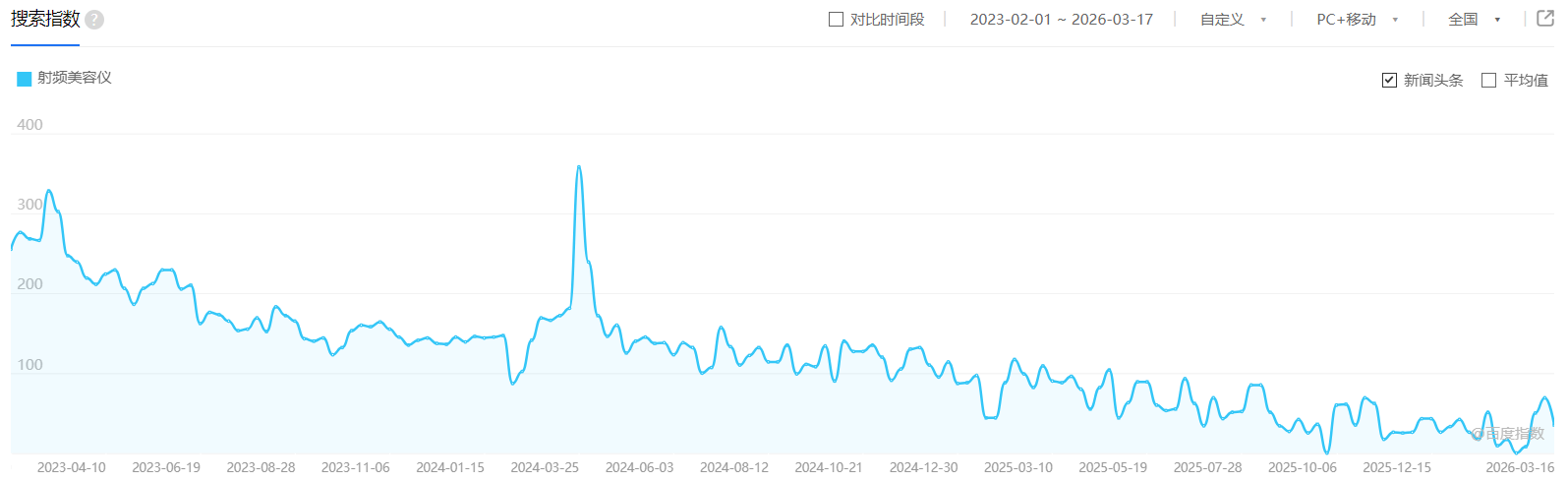 2023年2月1日—2026年3月17日,“射频美容仪”关键词的搜索指数(互联网用户对关键词搜索关注程度及持续变化情况)图源:百度指数
