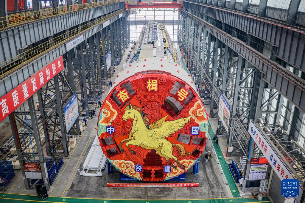 3月31日拍摄的“奋楫号”盾构机下线现场(无人机照片)。新华社发(刘甲摄)