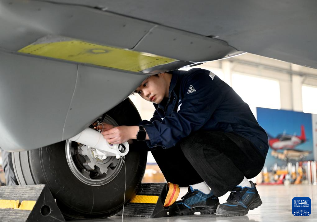 3月30日,在河南郑州上街机场,工作人员在试飞前检查运投无人机长鹰-8轮胎。新华社记者 郝源 摄