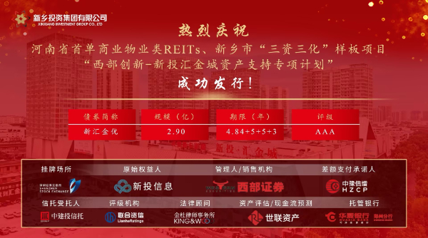 本项目是新乡市“三资三化”样板项目,亦是河南省首单商业物业类REITs产品。标的物业新投汇金城位于新乡市火车站核心商圈,建筑面积15.09万㎡,为主营家居百货、皮衣皮草、时尚潮服、婴童服装、针织家纺的综合性批发零售商场。作为金融不良资产,汇金城经新乡投资集团按照市委市政府纾困计划收购、更名、并实施系列化升级改造后,运营情况大幅改善,已成为豫北区域知名的针织品类集散地。本项目的成功落地,进一步盘活存量资产,丰富融资工具,拓宽融资渠道,为新乡投资集团探索出一条“收购-运营-证券化”的可持续发展道路。