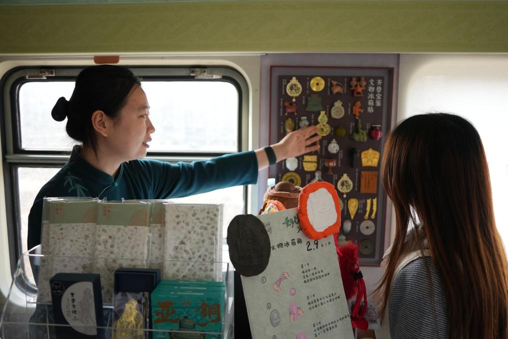 青铜、玉、瓷、陶、画像石……登上列车,乘客穿行在不同文物主题的车厢间,仿佛穿越时空,与文物创意相伴,开启一场文化之旅。