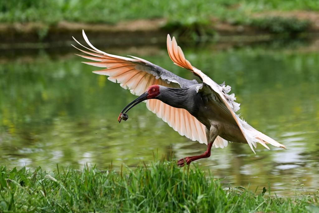3月30日,朱鹮在洋县草坝村的一处水塘觅食。