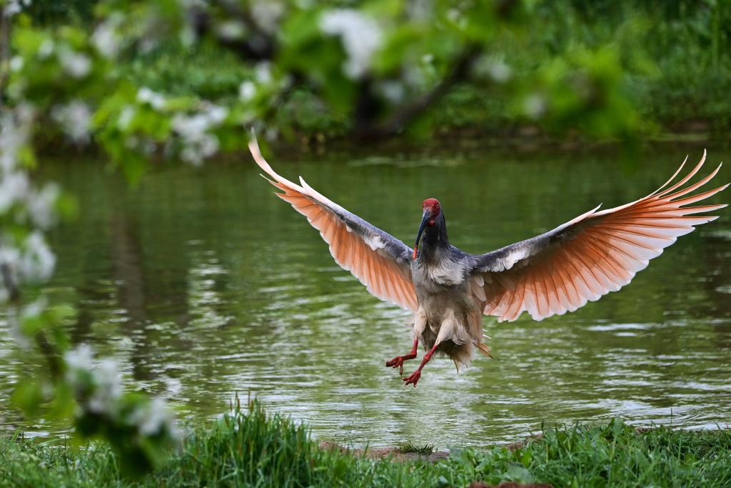 3月30日,朱鹮从洋县草坝村的梨树上方飞过。
