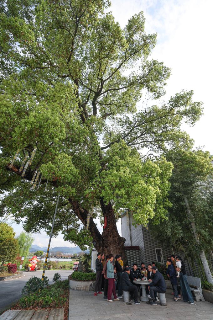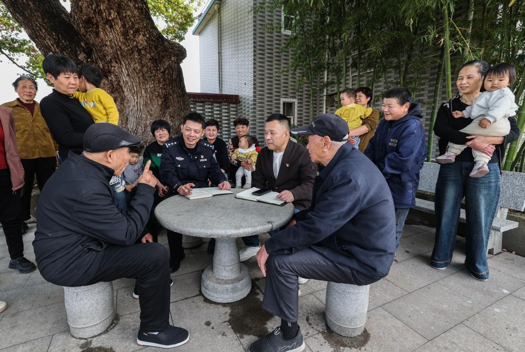 4月1日,丰江周村村干部、社区民警和村民围坐在大樟树下开议事会。