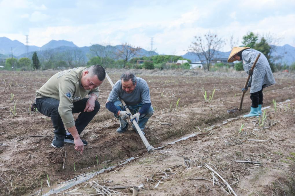 4月1日,丰江周村村干部(左)与村民在甘蔗地里查看甘蔗苗生长情况,沟通解决种植养护过程中遇到的问题。