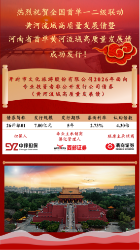 西部证券担任主承销商的“开封市文化旅游股份有限公司2026年面向专业投资者非公开发行公司债券(黄河流域高质量发展债) ”于2026年3月31日成功簿记。西部证券充分发挥资本中介优势,通过推动一二级市场协同,助力该债券成为全国首单一二级联动的黄河流域高质量发展债,亦为河南省首单黄河流域高质量发展债。本期债券期限5年,发行规模7亿元,票面利率2.73%,全场认购4.3倍,本期债券的成功发行,既是金融服务黄河流域生态保护和高质量发展国家战略的实质性突破,也是西部证券深度践行金融“五篇大文章”、深耕服务中西部区域和文旅行业高质量发展的生动缩影。