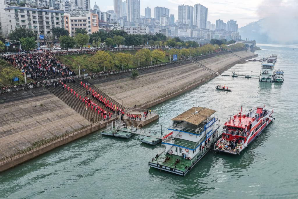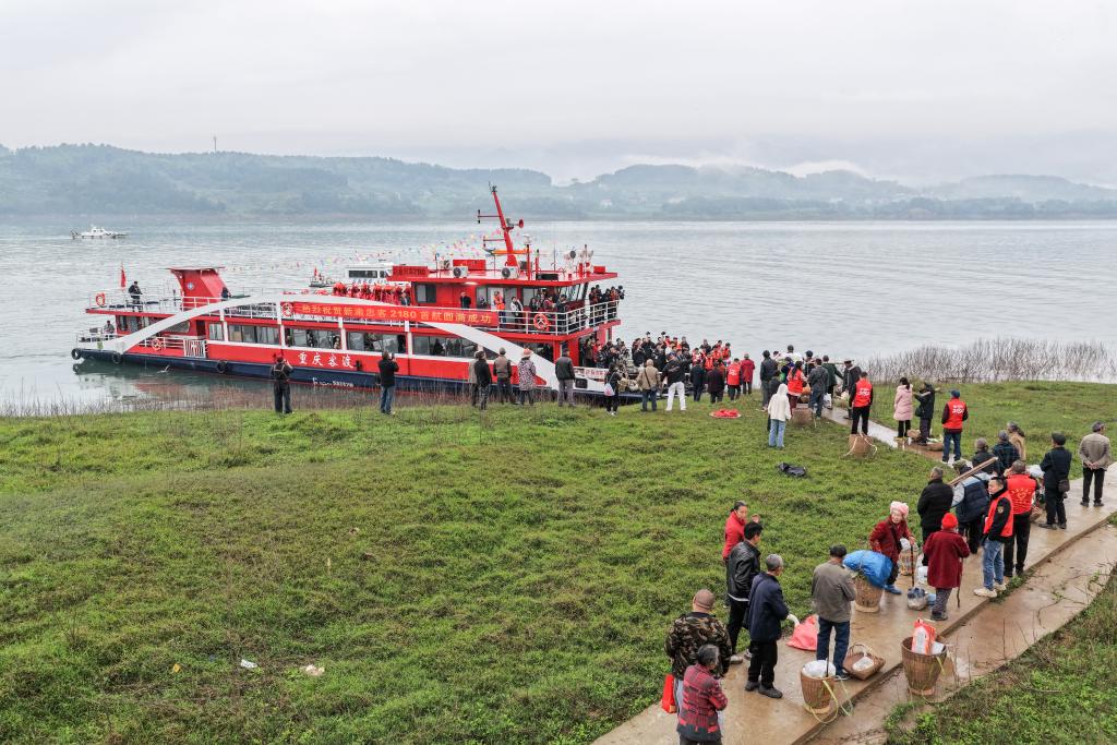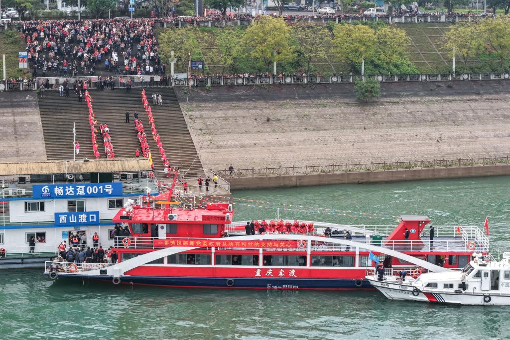 3月31日,在重庆忠县西山码头,群众热情欢迎搭乘首趟“新渝忠客2180”客轮的乘客。