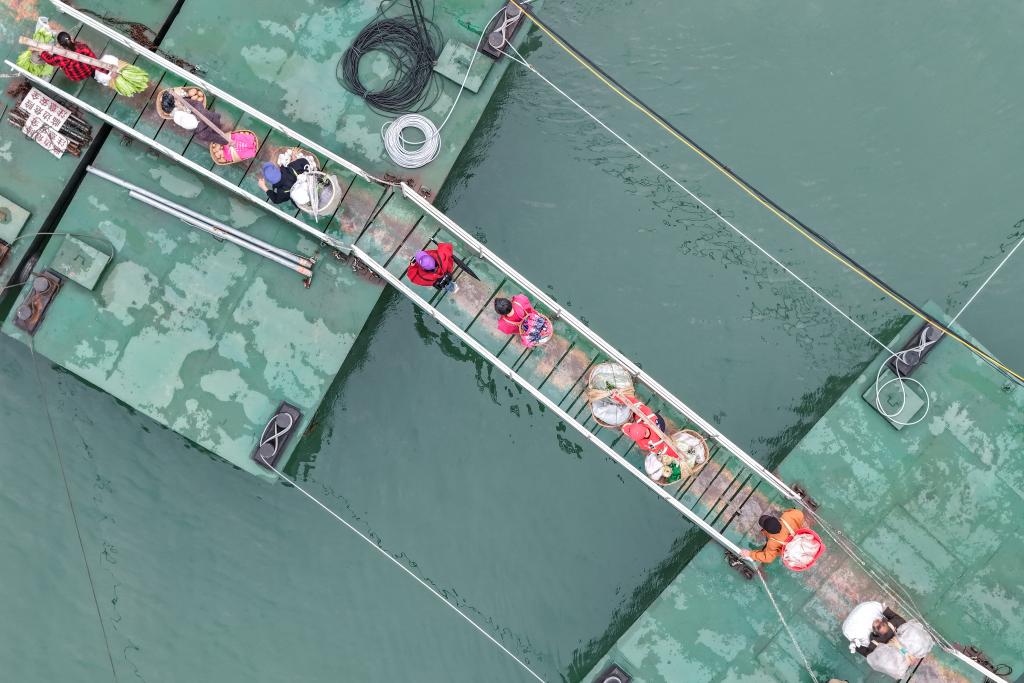 3月31日,“新渝忠客2180”客轮抵达忠县县城后,菜农下船前往集市售卖农特产品(无人机照片)。