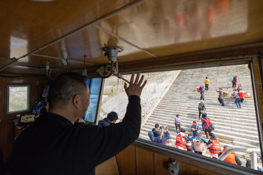 3月30日,在长江重庆忠县段,秦大益向搭乘最后一趟“渝忠客2180”客轮的乘客挥手告别。