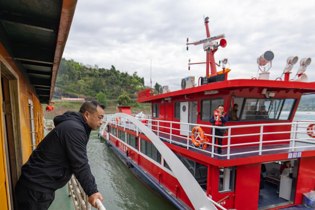 3月30日,在长江重庆忠县洋渡码头,秦大益站在“渝忠客2180”客轮上注视“新渝忠客2180”客轮。