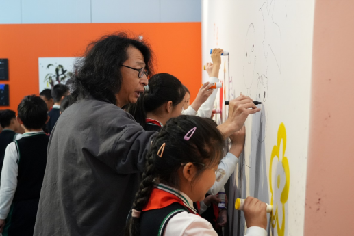 BIB金苹果奖得主中国插画家乌猫、黑眯也亲临现场,在“与大师共绘”展区即兴绘画,展现深厚艺术功底,引发观众阵阵赞叹。乌猫还为孩子们带来“画家也要改作业”工作坊,他用自己的成长故事和作品向孩子们讲述了绘本从灵感到构图、线条、色彩以及故事完成中一步步修改完善的过程,以沉浸式美育启迪童心。