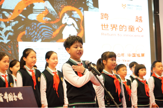 4月2日展览开幕现场,北京市朝阳区垂杨柳中心小学学生带来了配乐诗朗诵《种下故事,静待花开》,用清澈童声传递阅读的力量,邀请现场观众共同成为“一名神奇故事的播种人——播撒文字,培育画面,收获惊喜,浇灌想象。”
