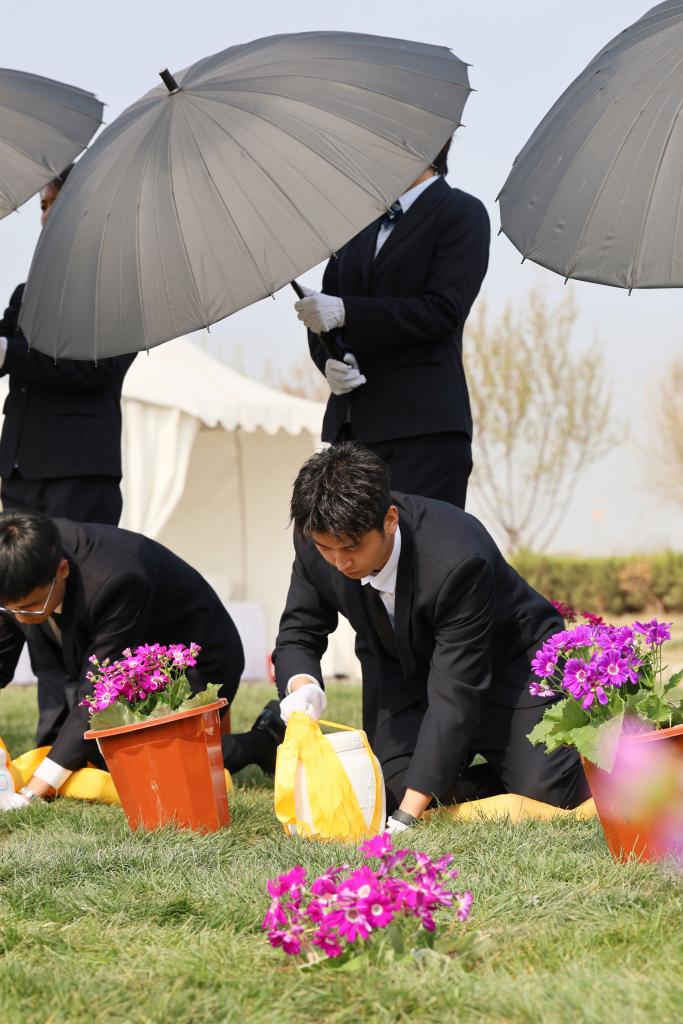 4月2日,礼仪人员在活动现场将可降解骨灰坛埋入草地之中。