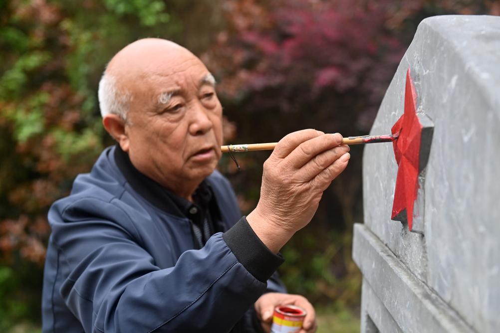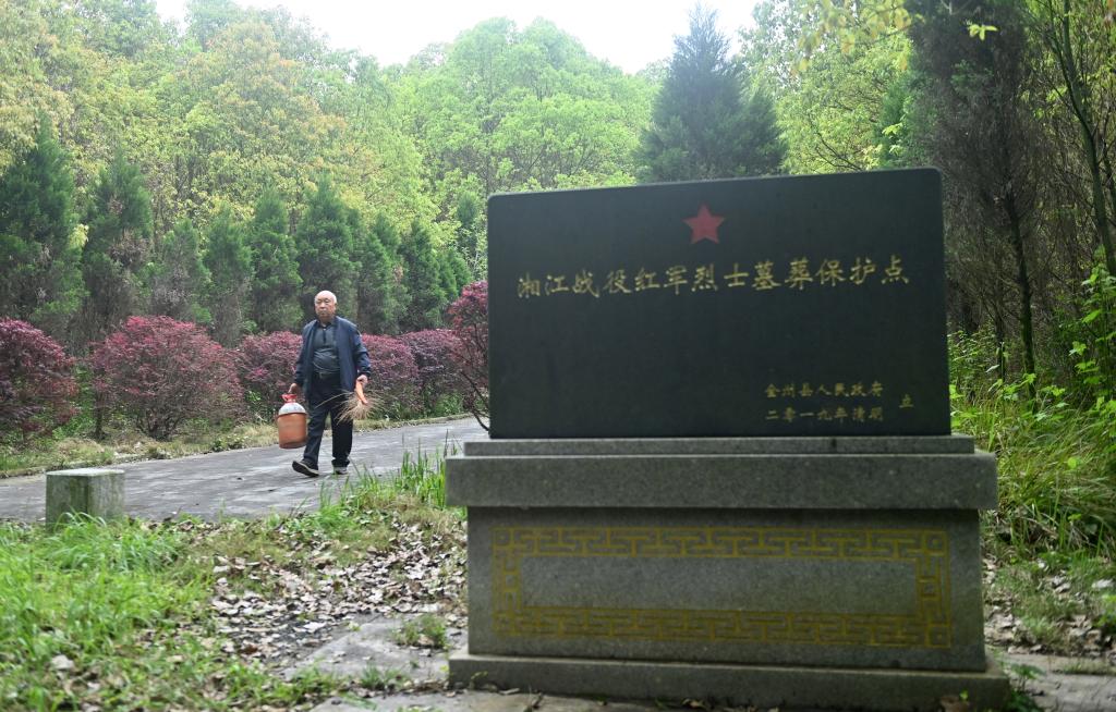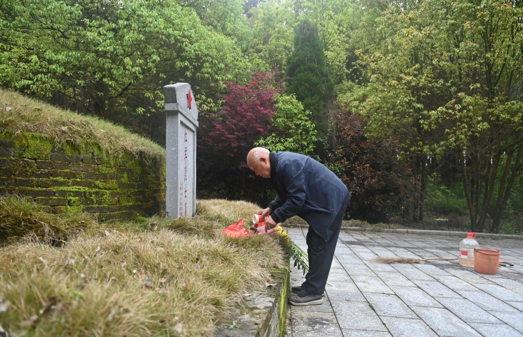 4月2日,在广西全州县米花山红军烈士墓,蒋石林老人在擦洗红军墓碑。