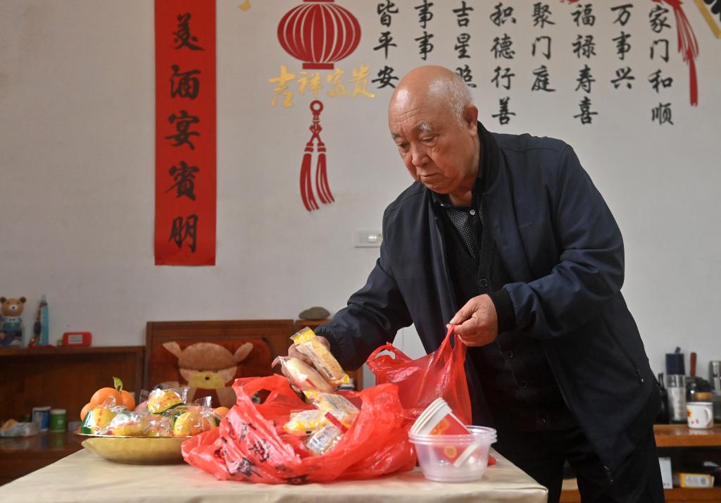 4月2日,在广西全州县才湾镇才湾村的家里,蒋石林老人在整理食品准备去祭奠红军烈士。