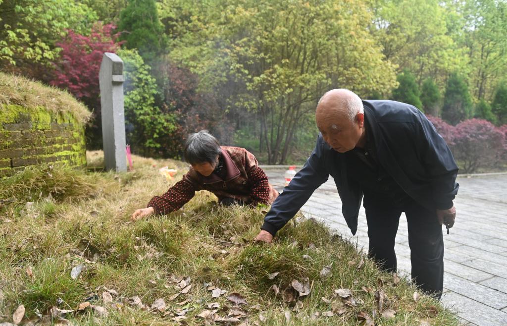 4月2日,在广西全州县米花山红军烈士墓,蒋石林老人(右)和老伴李桂英在清除红军烈士墓边的杂草落叶。