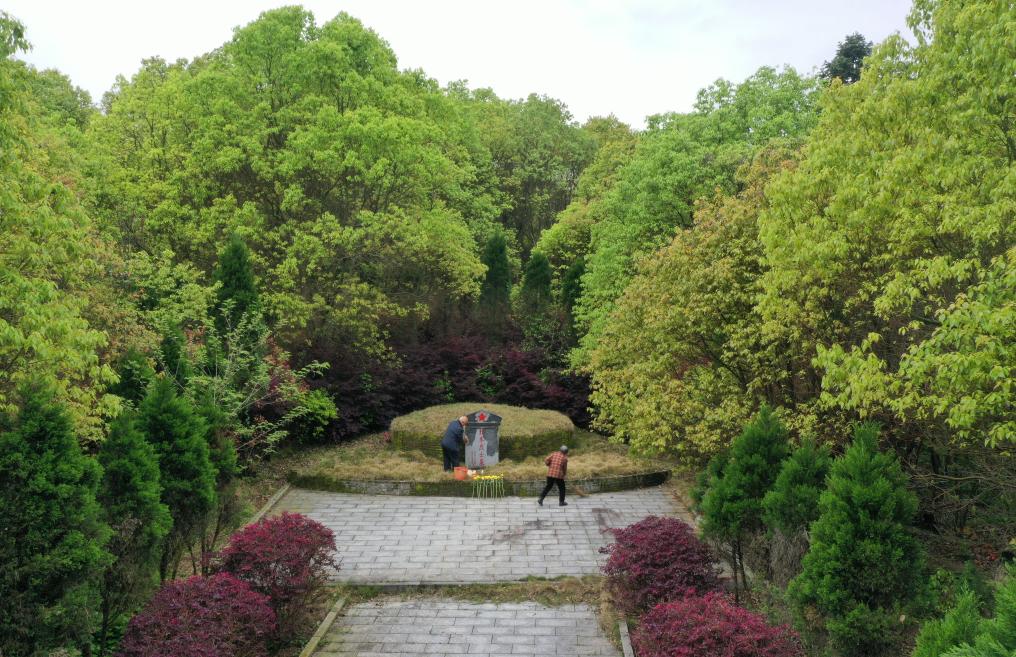 4月2日,在广西全州县米花山红军烈士墓,蒋石林老人(左)和老伴李桂英在给烈士墓打扫卫生(无人机照片)。
