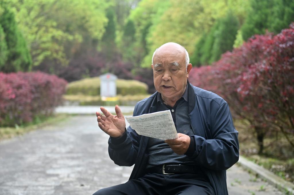 4月2日,在广西全州县米花山红军烈士墓,蒋石林老人在准备有关湘江战役历史的解说词。