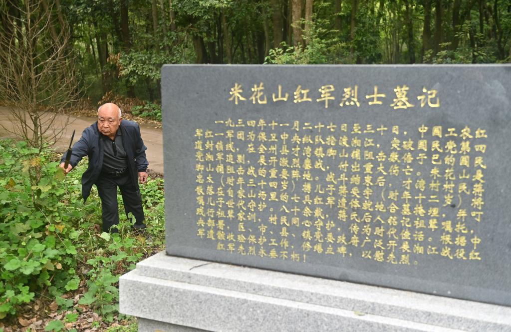 4月2日,在广西全州县米花山红军烈士墓,蒋石林老人在清除烈士墓附近的杂草。