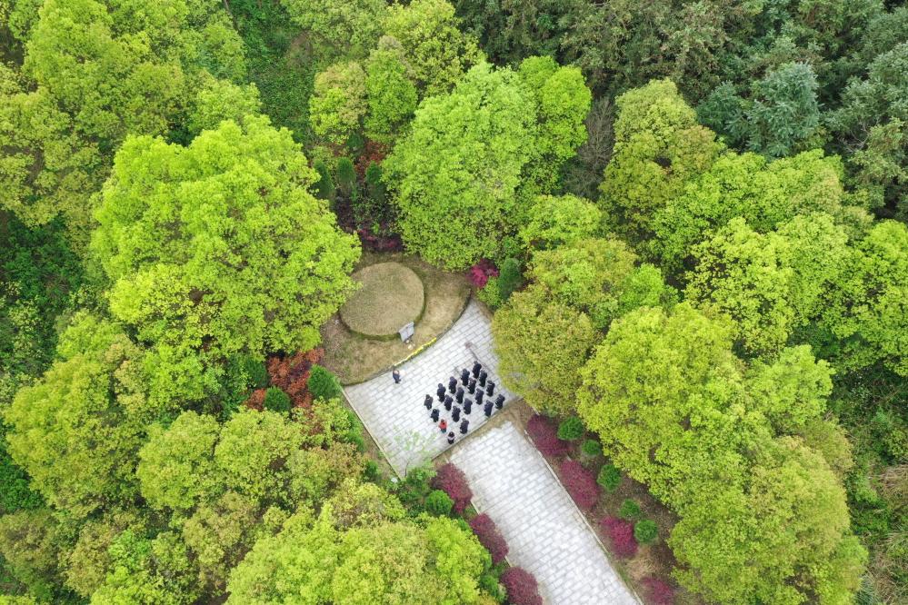 4月2日,在广西全州县米花山红军烈士墓,蒋石林老人(前)在给前来祭扫烈士墓的人讲述自己一家人守墓的历史(无人机照片)。