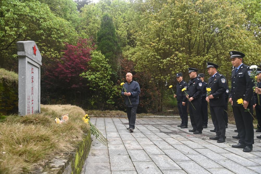 4月2日,在广西全州县米花山红军烈士墓,蒋石林老人(左一)在和前来扫墓的人一起给烈士献花。