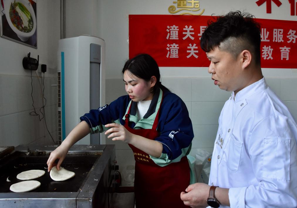 新华社西安4月3日电(记者郑昕)“面揉得好,烤出来的馍就香。”在陕西省潼关县职业教育中心教室里,老师曹侨把面团分给20多名学生,大家一起又揉又擀,做成千层饼放入烤炉。才几分钟,清甜的麦香就充盈了整间教室。