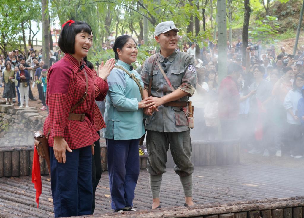 车轱辘在石板路上吱呀作响,头顶“敌机”呼啸而至,“炸弹”在身旁骤然炸开,游客捂耳蹲伏、相互掩护;当冲锋号角响起,“演员们”齐声呐喊、冲向城门;当胜利的旌旗扬起,大家欢呼雀跃,扭起秧歌、跳起舞蹈——这并非影视片场,而是红嫂家乡旅游区推出的行进式互动体验项目《重走支前路》的现场。