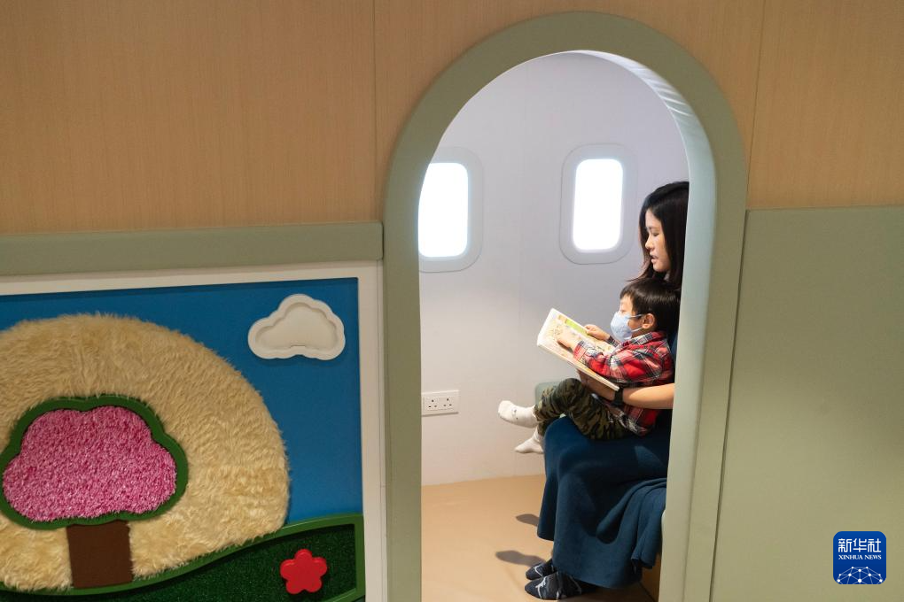 在位于香港国际机场一号客运大楼的“感知阁”内,邓女士陪伴被诊断为孤独症的儿子阅读搭乘飞机的绘本(3月31日摄)。 新华社发(龙镜伊 摄)