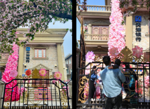院外风车轻转,花影映着洋楼,站在外面“风车+海棠+洋楼”层次构图,轻松出图;院内巨大花束、楼体花瀑、欧式栏杆.....处处都好拍。