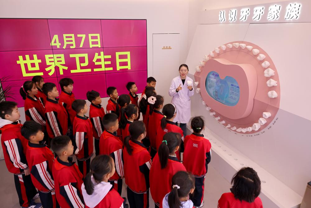4月7日,在山东省枣庄市口腔科普馆,医务人员为前来参观学习的小学生们普及牙齿健康知识。