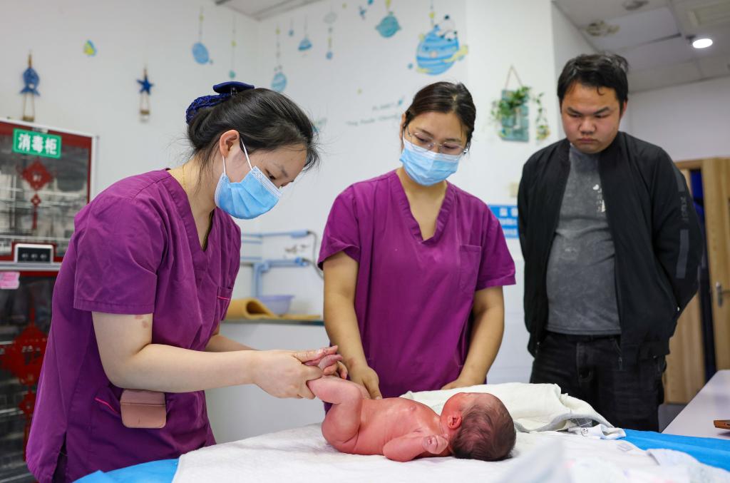 4月7日,在贵州省铜仁市玉屏侗族自治县人民医院产科,医护人员为新生儿家属传授按摩技术。