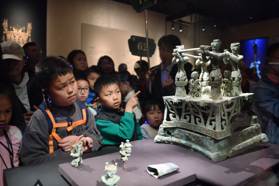 4月3日,小朋友在三星堆博物馆观看展品。新华社记者 卢哲 摄