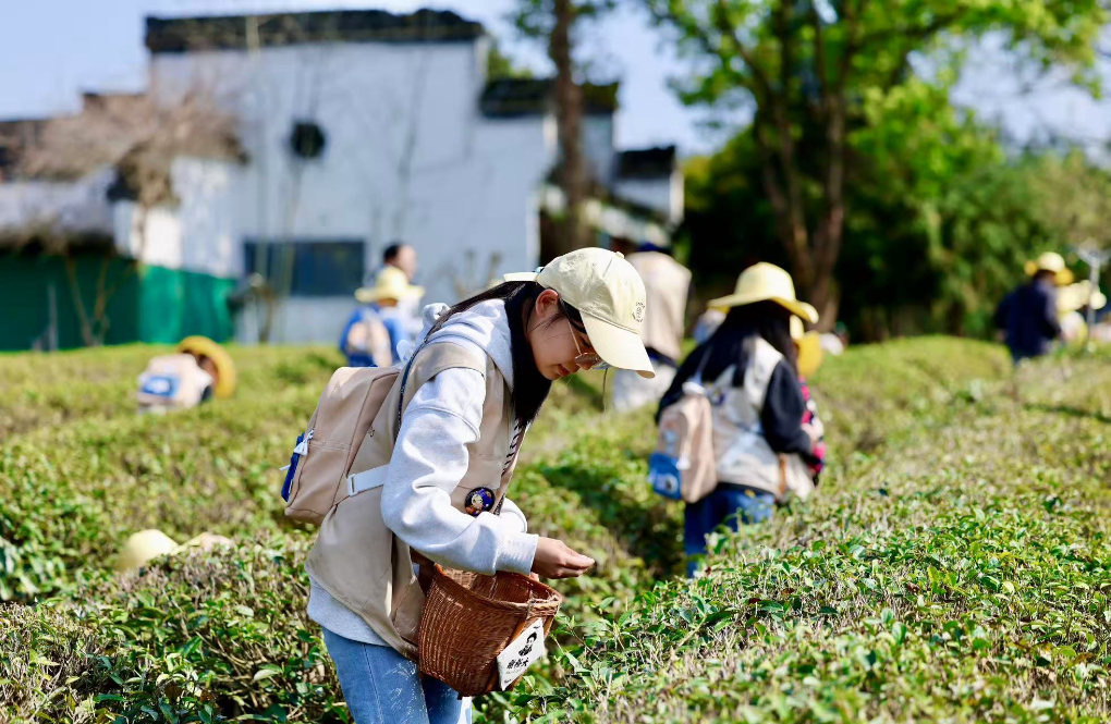 4月1日,安徽春假首日,合肥市中小学生体验采茶。新华社发(施亚磊摄)