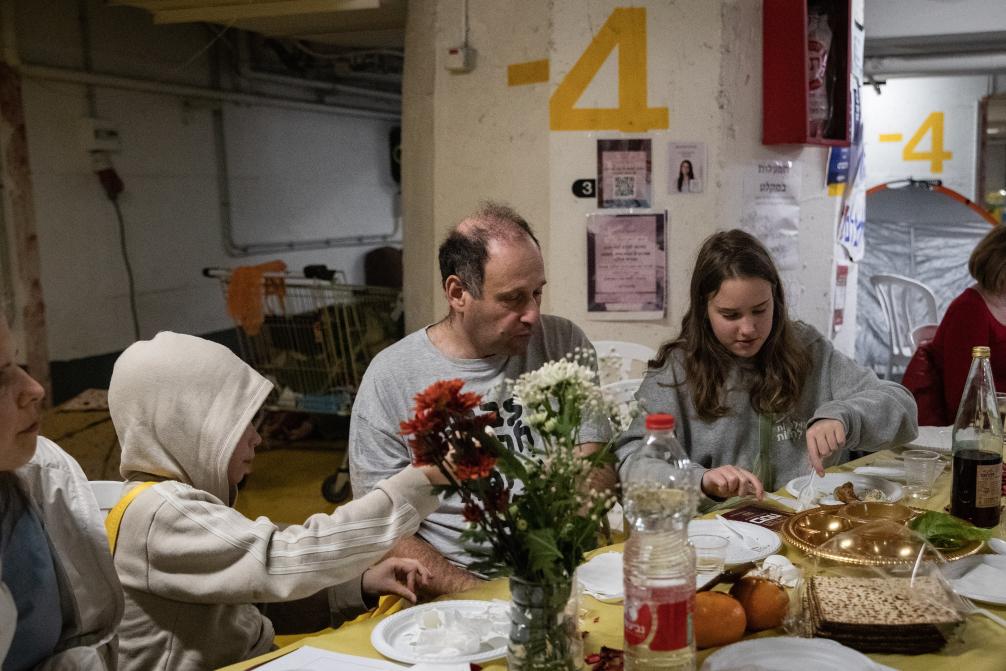 4月1日,在以色列特拉维夫的一处地下防空设施,人们参加逾越节晚餐仪式。新华社记者陈君清摄