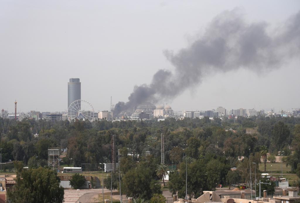 3月21日,位于伊拉克首都巴格达曼苏尔区的巴格达国际会展中心附近升起浓烟。新华社记者段敏夫摄