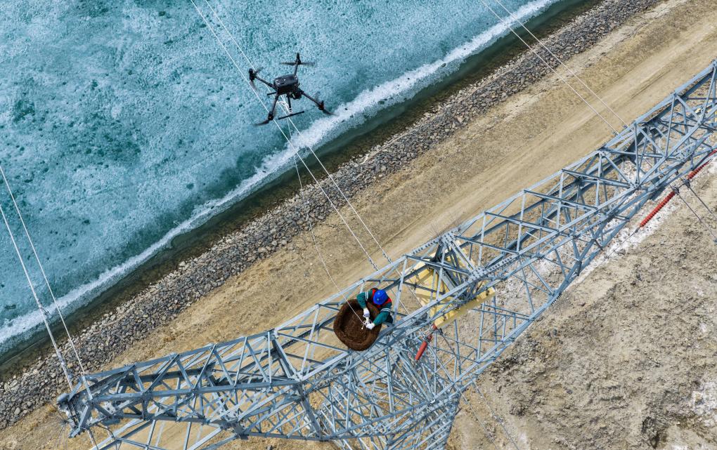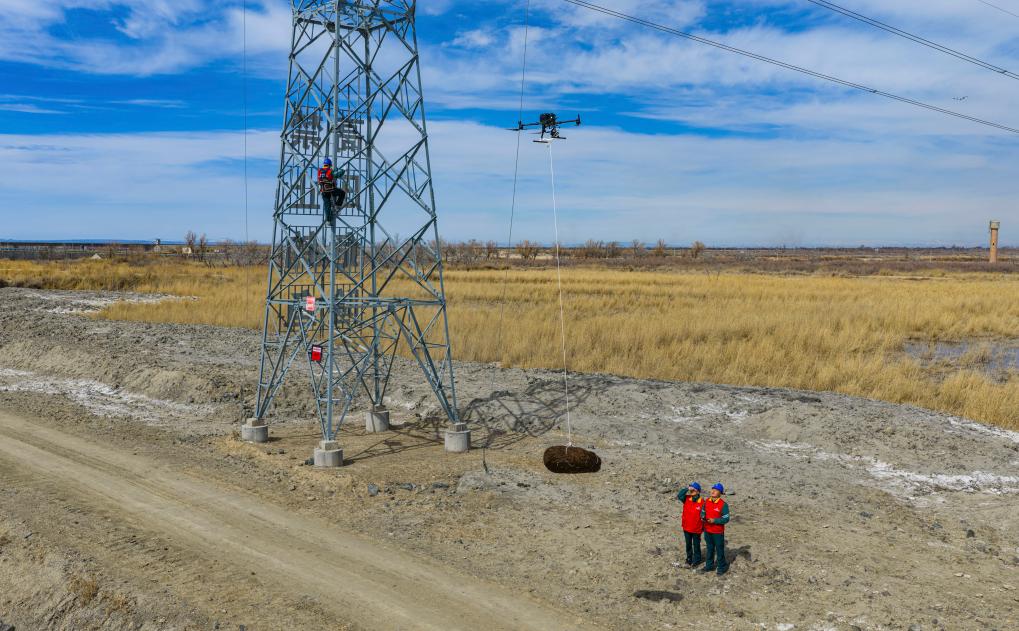 在位于新疆阿勒泰福海县的乌伦古湖国家湿地公园,国网阿勒泰供电公司工作人员借助无人机吊运生态鸟巢(4月1日摄,无人机照片)。