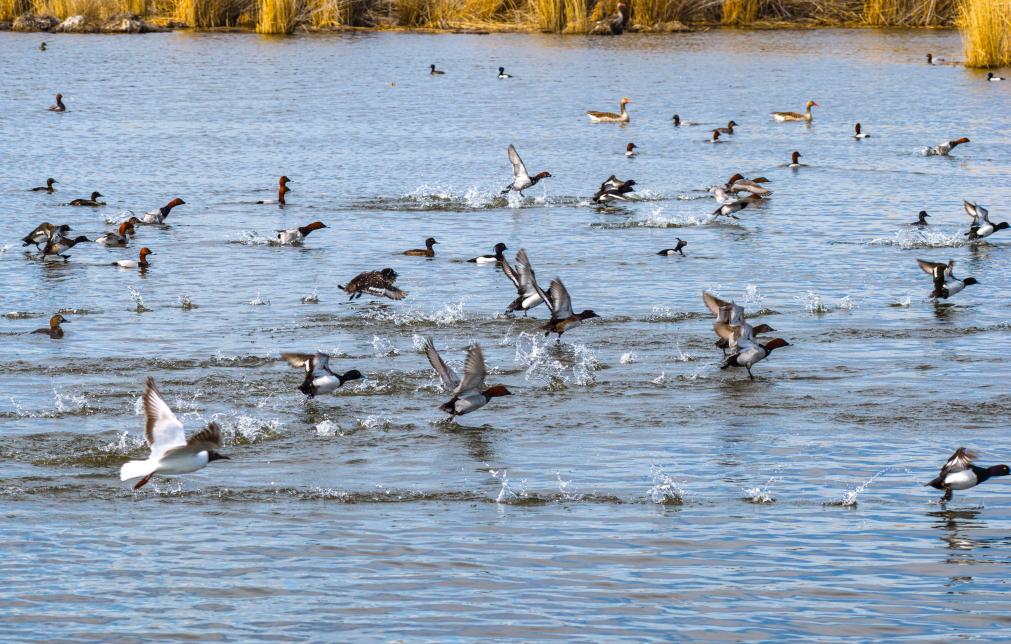 候鸟在位于新疆阿勒泰福海县的乌伦古湖国家湿地公园游水嬉戏(4月8日摄,无人机照片)。