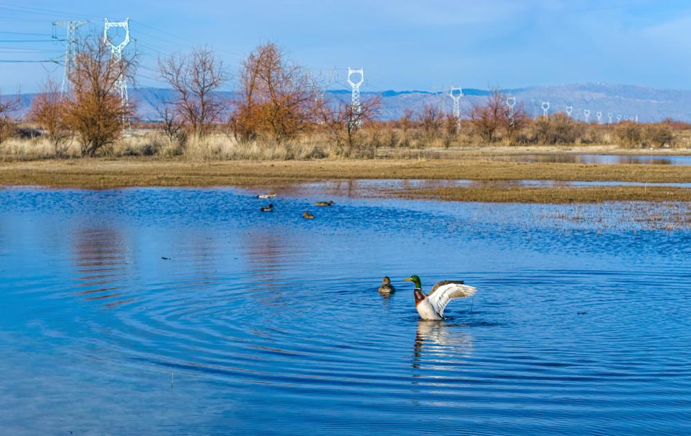 在位于新疆阿勒泰福海县的乌伦古湖国家湿地公园,候鸟在输电线路旁游水嬉戏(4月1日摄)。