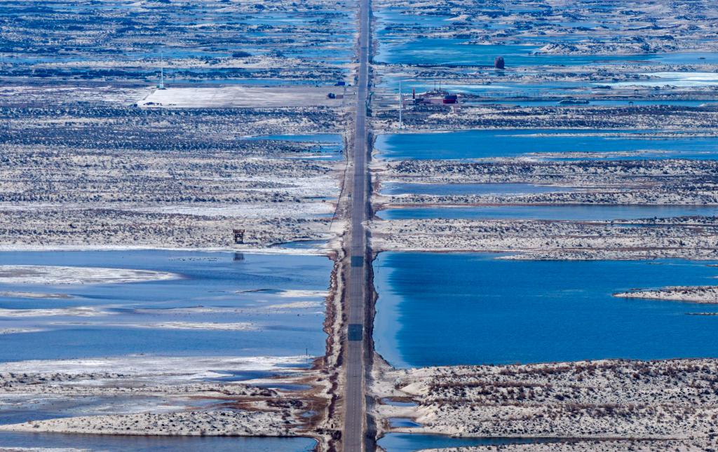 在位于新疆阿勒泰福海县的乌伦古湖国家湿地公园,高压线路横跨沼泽湿地(4月1日摄,无人机照片)。