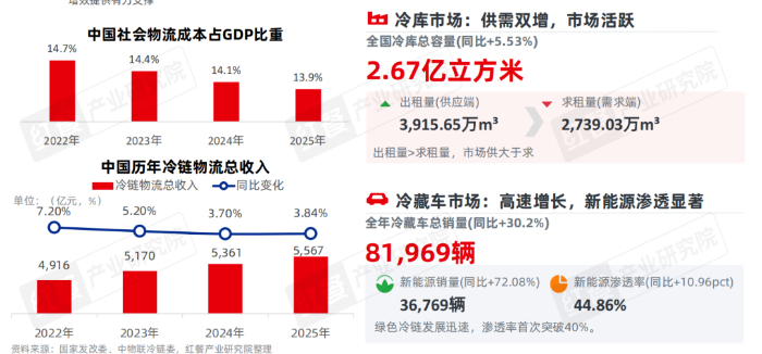 中国物流成本占GDP比重已从2022年14.7%持续下降至2025年13.9%。冷链物流总收入在2025年达到5,567亿元,同比增长3.84%。在政策支持和引导以及市场需求的驱动下,冷库规模稳步增长。2025年,全国冷库总容量为2.67亿立方米,同比增长5.53%;2025年全年冷藏车销量为81,969辆,同比增长30.2%。