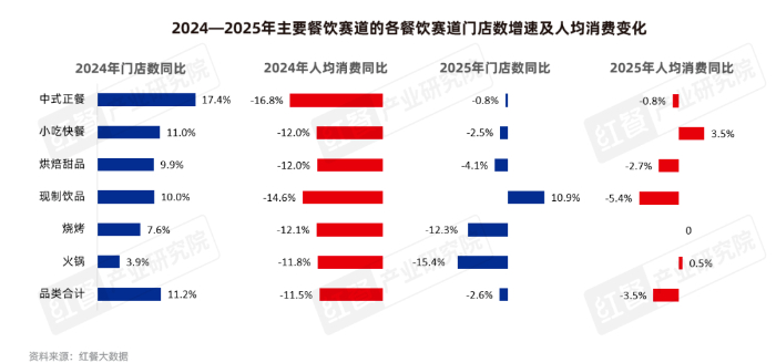 具体到餐饮行业来看,2024—2025年,各餐饮赛道的门店扩张与人均消费呈现分化特征。2024年全品类门店数同比增长11.2%,其中中式正餐、小吃快餐等大众品类扩张最快,但全品类人均消费同比下降11.5%,现制饮品、中式正餐的价格降幅尤为显著。