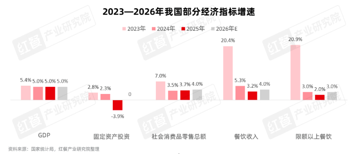 2025年我国GDP增速为5.0%,与2024年保持一致。社会消费品零售总额增速为3.7%,高于去年3.5%的增速。但餐饮收入在2025年增速仅为3.2%,相比2024年的5.3%进一步下滑。其中限额以上餐饮的增速下滑至2.0%。