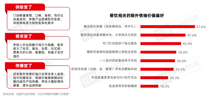 当前餐饮行业的供给、需求与传播环境已发生根本性变化,情绪价值成为品牌破局的关键抓手。供给端,门店数量激增,口味、食材、性价比高度趋同,单靠产品难以拉开差距;需求端,年轻人外出就餐更多是为了社交、解压、治愈与仪式感,愿意为好心情支付溢价;传播端,社媒发达,情绪体验可带动社媒内容生产与广泛传播,大幅降低获客成本。