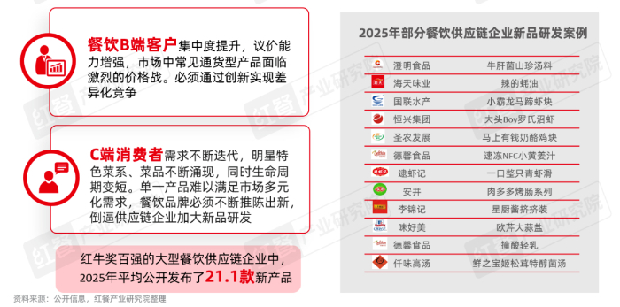 从红餐产业研究统计的数据来看,在红牛奖百强的大型餐饮供应链企业中,2025年平均公开发布了21.1款新产品,如澄明食品的牛肝菌山珍汤料、仟味高汤的鲜之宝姬松茸特醇菌汤等,充分体现了行业通过海量新品布局、分散风险、捕捉市场机遇的核心策略。