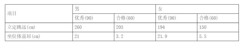 项目为坐位体前屈和立定跳远两项,执行《国家学生体质健康标准》(高三毕业生评价指标)(详见附件)。体育测试结果不计入综合成绩,合格即可,但凡有一项测试不合格者即失去参加综合能力测试资格。因残疾或重疾等身体原因不能参加体育测试的考生,可凭相关证明免除体育测试,其余考生均需参加两项测试。考生因临时生病不能参加体育测试,可凭二级甲等以上医院病历办理缓测手续,后期按规定补测,补测不合格者取消入学资格。